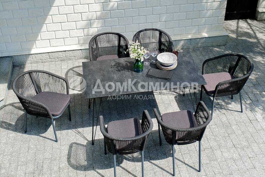 Каркас стульев - алюминиевый, оплетен вручную современным материалом - роупом. Это эластичные синтетические ленты из высокопрочных полиэфирных волокон. В комплект входят подушки со съемными водоотталкивающими чехлами серого цвета.