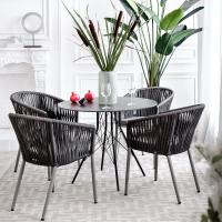 Обеденная группа состоит из стола со столешницей HPL цвета серый гранит, диаметр 90 см (стальное подстолье) и четырех кресел из алюминиевого каркаса, оплетенного вручную эластичными синтетическими лентами из высокопрочных полиэфирных волокон, в комплекте с подушкой, цвет темно-серый.