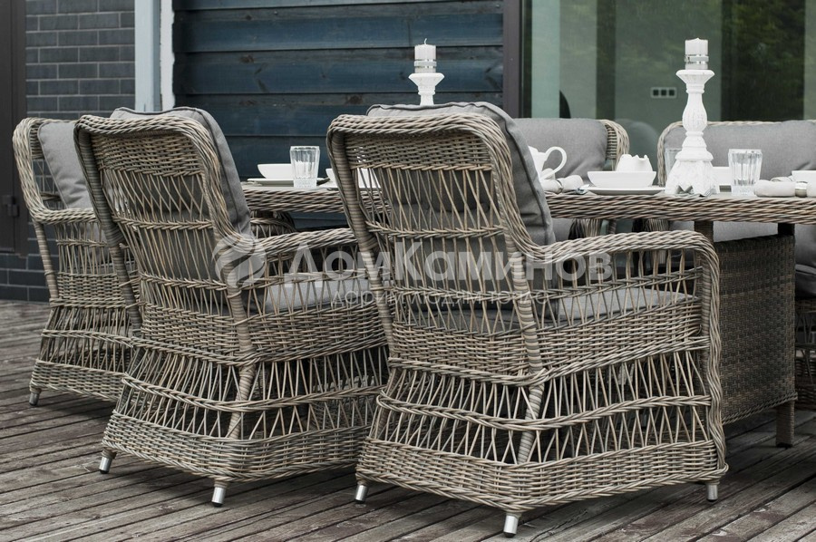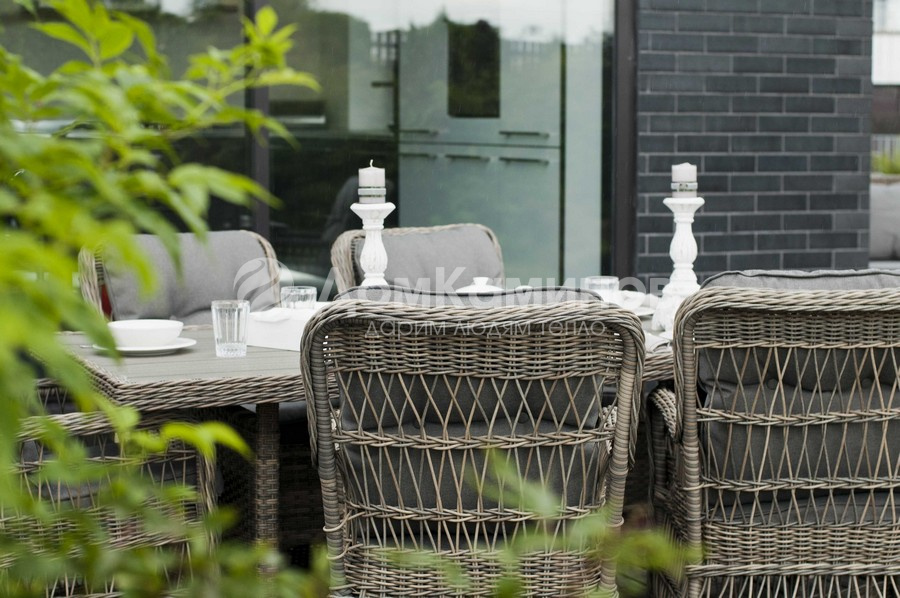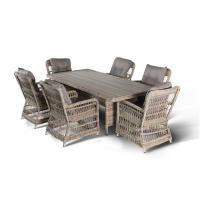 Обеденная группа Цесена на 6 персон обеспечит удобство и уют дружной компании. Прочный каркас стульев изготовлен из алюминия, что гарантирует продолжительный срок службы модели. Стулья с подлокотниками отличаются повышенным удобством, и комплектуются мягкими подушками для максимального комфорта. Ручное плетение из искусственного ротанга делает неповторимым и уникальным каждое изделие. Вместительный прямоугольный стол выполнен из алюминиевого каркаса, оплетенного искусственным ротангом со столешницей из ДПК. В солнечных лучах плетение приобретает более светлый и яркий оттенок.