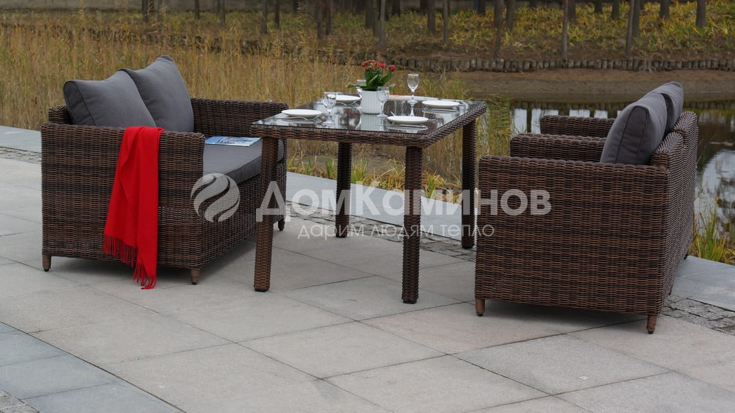 В комплект обеденной группы входит один обеденный стол, один двухместный диван, два кресла и подушки.