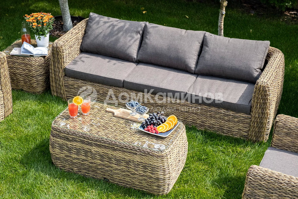 "Кальяри" журнальный столик, алюминиевый каркас, искусственный ротанг вида "гиацинт", ручное плетение, столешница из закаленного стекла толщиной 5 мм, размер: 590x1050x430 мм, цвет соломенный.