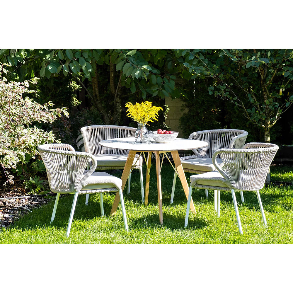 Стул "Милан" для обустройства обеденной или лаунж-зоны.Изготовлен из алюминиевого каркаса, оплетенного вручную эластичными синтетическими лентами из высокопрочных полиэфирных волокон (роуп круглый). Цвет каркаса - белый, оплетки - бежевый.В комплект входит подушка со съемным чехлом из 100%-го полиэстера с влагоотталкивающей пропиткой.Размеры плетеного стула - 570х620х800 мм.